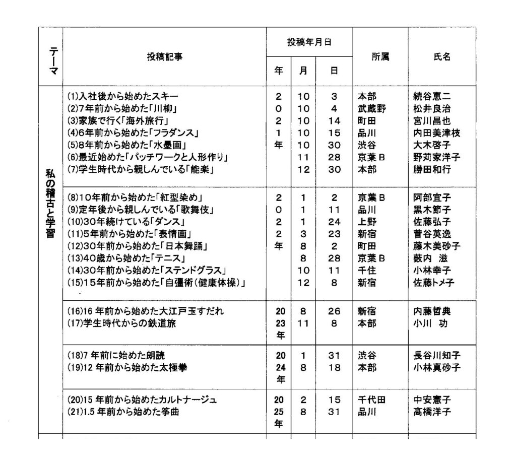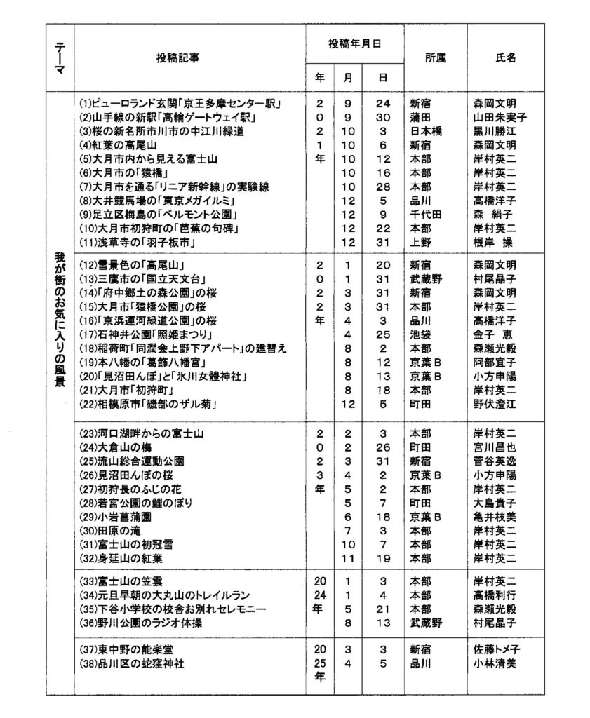 そこで、今回、全投稿記事を5つの投稿受付箱(=テーマ)別に投稿年月日順に投稿者名を掲載した「インデックス」を作成しましたので、ご存知の会員さんの名前で記事を探せば、その方の知らない側面を覗くことが出来ますし、関心のあるテーマ(趣味や観光スポットやペット等)から記事を探せば、きっと新たな情報を得られると思います。