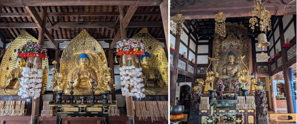 三仏堂ー中央に上品(ジョウボン)堂・向かって右側に中品(チュウボン)堂・向かって左側に下品(ゲボン)堂の三つの仏堂ーは、寺の名前の由来となった九躰の印相の異なる阿弥陀如来像がそれぞれ三躰ずつ安置されています。極楽往生を願う人の性質や行業によって九階位に分けられるそうです。