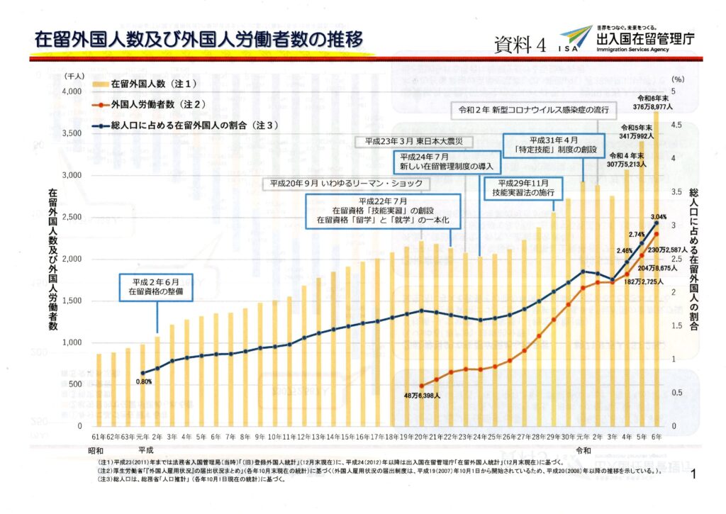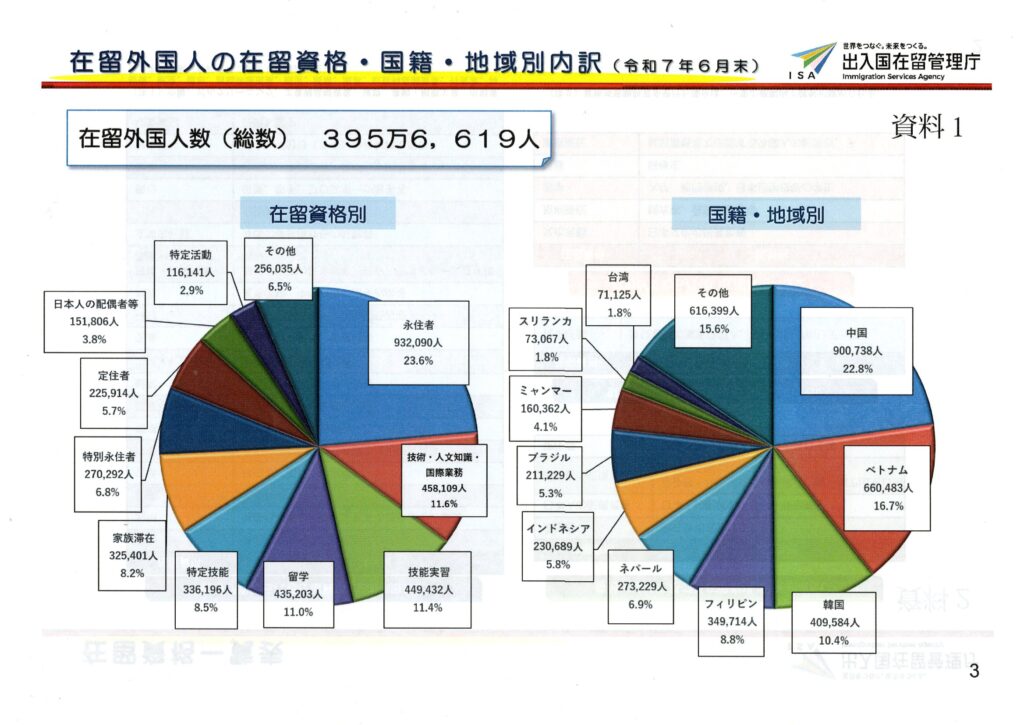 令和7年6月末時点での在留外国人数は395万人。日本人に対する外国人比率は 3.2%。これが2040年になると10%になると予測されているそうです。
