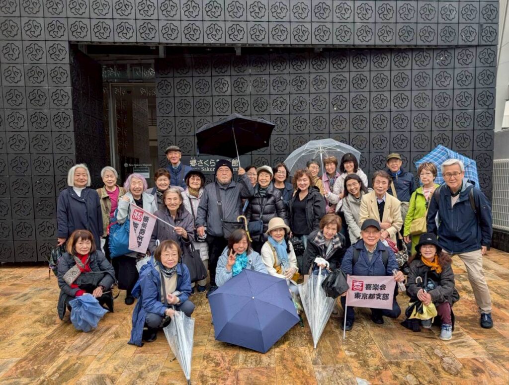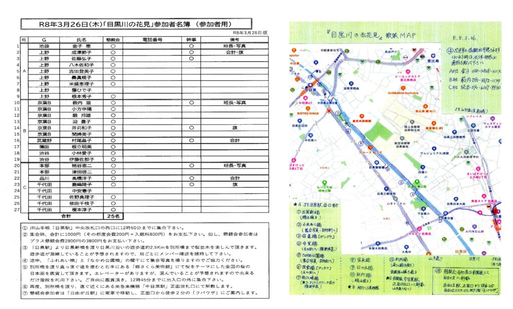 当日は天気予報通りで朝から雨が降っていましたが、目黒駅改札口に早くから次々と皆さんが集まられ、集合された順にお世話役の薮内さん作成の「目黒川お花見散策MAP」を含めた資料が配られました。参加者27名の全員が揃ったところで、薮内さんより資料に基づいて、コース説明と集合写真を撮る場所の説明、万一はぐれた時の為に3班に分かれて移動等の話がありました。