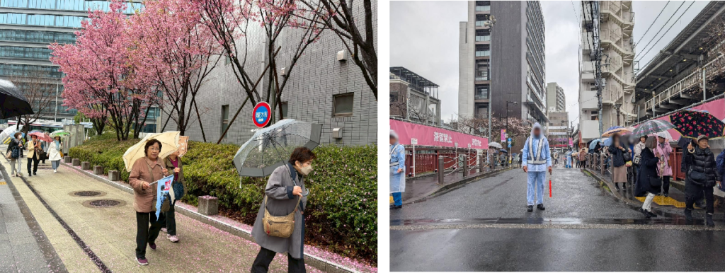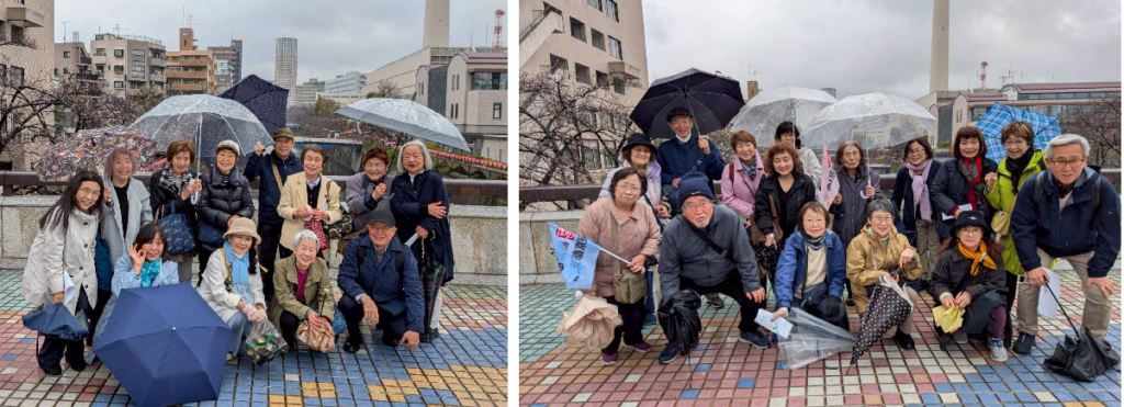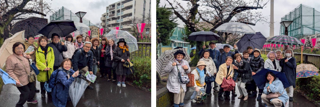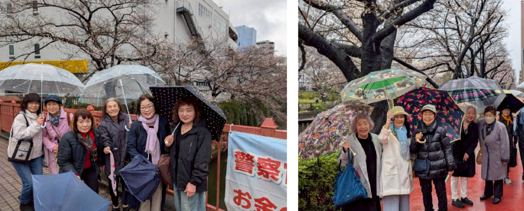 昨年同様に雨天のお花見なのでだいぶ空いており、当初心配していたような、人混みでお互いに見失うこともなく、全員で移動できたのはよかったです。毎年お花見の時期は、川沿いの花見客で混雑し、屋台も沢山出るようなので、ばらばらの移動になって道順から外れてしまわないか、集合写真が撮れるか、等を鑑みて今回は3班体制となっていましたが、それらの心配なく全員で移動することができました。
