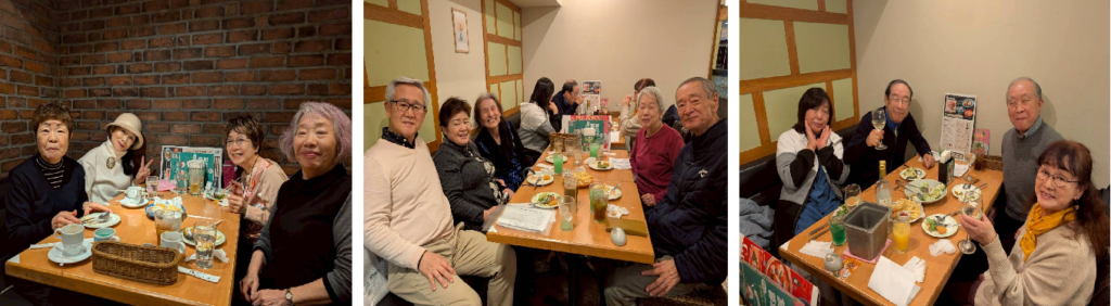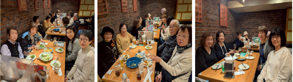 懇親会に参加の25名は、東横線に乗り「自由が丘駅」で下車、徒歩2分のお店「ラパウザ」へと向かいました。予約されているドリンクバー付きのイタリアンコース(2,800円)は品数も豊富で美味しくリーズナブルと皆さん好評のようでした。テーブル毎に、又は移動しながら和気あいあいと食事が進み、皆さん賑やかな時間を過ごされていました。